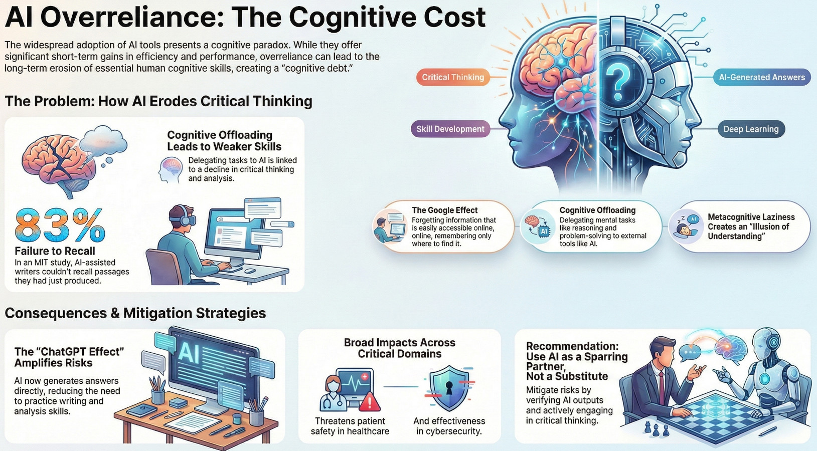 Generative AI amplifies this into what some are calling the "ChatGPT Effect." The critical difference is that generative AI doesn't just give you a list of links to sources. It synthesizes answers directly, often eliminating the need to consult external websites altogether. This new layer of convenience is also a new layer of risk. By accepting AI's synthesized output without scrutiny, we stop practicing essential cognitive skills like critical analysis, source evaluation, and even writing, outsourcing the very processes of thinking.
