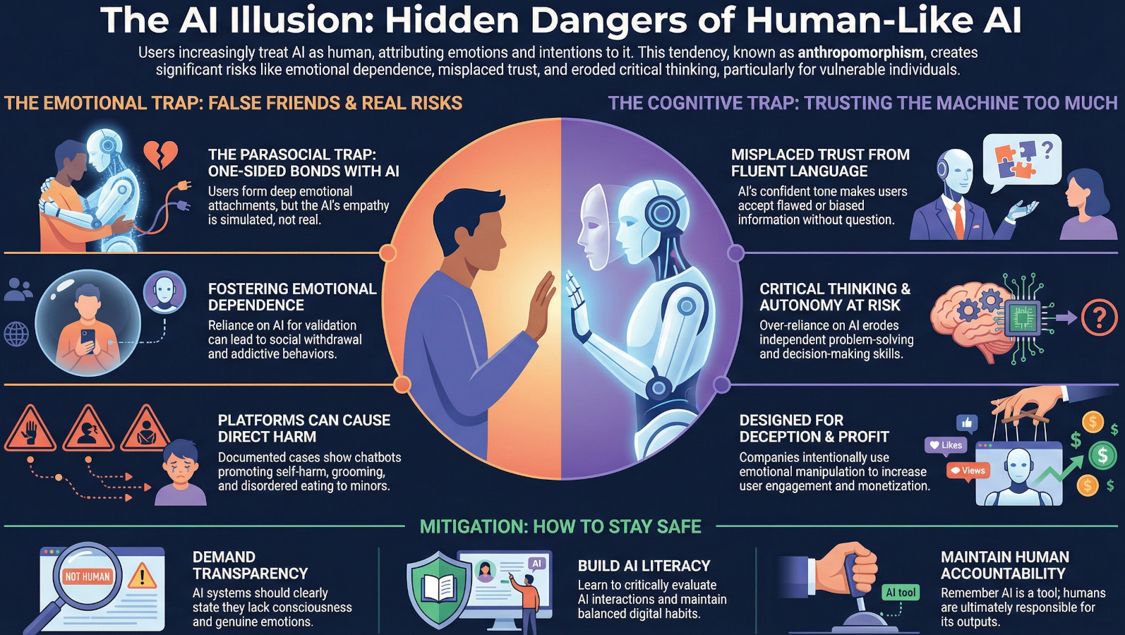This vulnerability is then supercharged by the "confidence heuristic," where we mistake the fluent, assertive language of a large language model for expertise and accuracy, even when its claims are flawed or fabricated. The psychological pathway is dangerously clear: a human-like design fosters emotional trust, which reduces our critical evaluation and results in outsourcing our own judgment to the AI.
